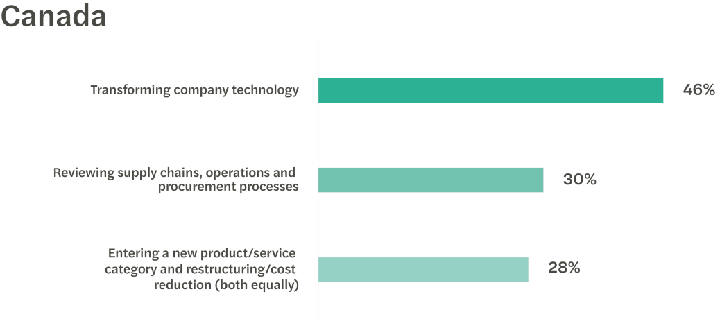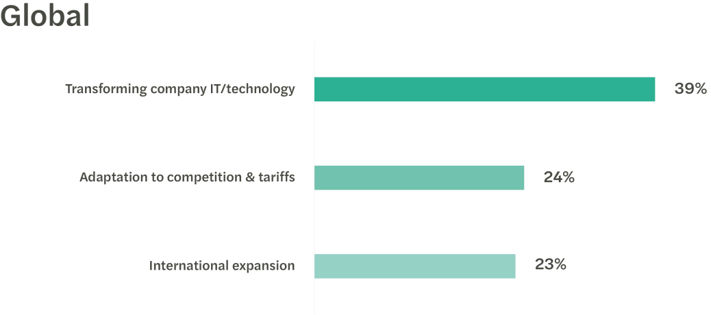 - Top strategic priority: Technological transformation (46%), followed by the reassessment of supply chains, operations, and procurement (30%).