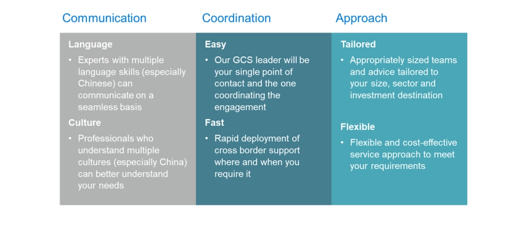 Covering 60 countries & territories outside China to support the development of Chinese companies overseas, we provide a full range of services including audit & assurance, outsourcing, financial advisory, and tax services.