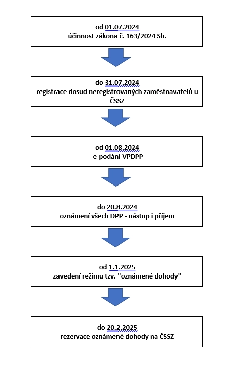 Od 1.1.2025 budou DPP již jen v tzv. režimu oznámené dohody. Ten bude možné uplatnit pouze na DPP u jednoho zaměstnavatele, a to u toho, který si „rezervuje“ zaměstnance jako první. Pro účast na pojištění bude rozhodná částka ve výši 25 % průměrné mzdy stanovené podle § 23b odst. 4 zákona č. 589/1992 Sb., zaokrouhlená na celé pětisetkoruny dolů. Výši rozhodné částky každoročně vyhlašuje MPSV ve Sbírce zákonů.