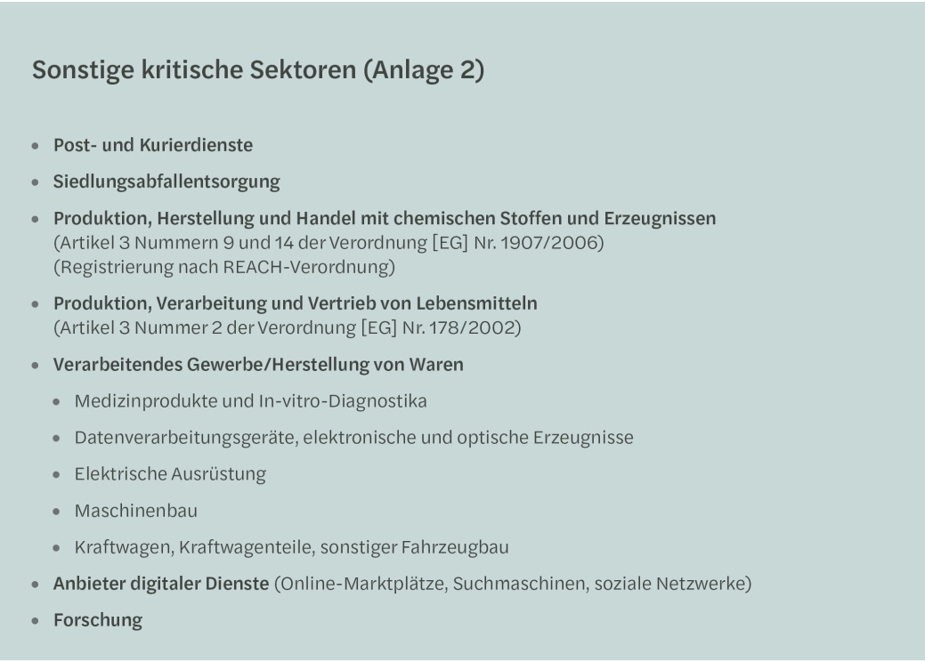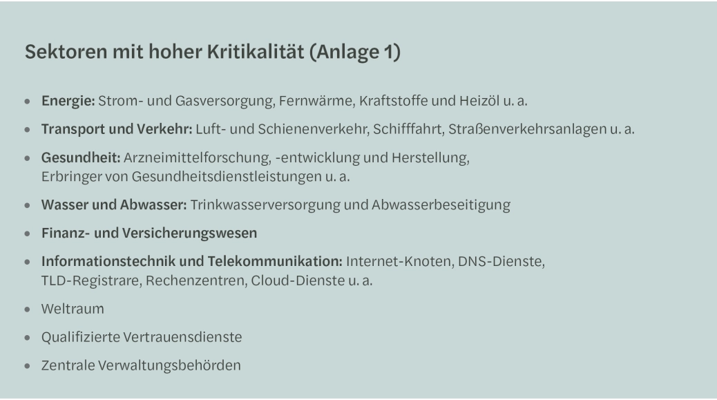 Kern der Regelung ist eine vollständige Überarbeitung des Gesetzes über das Bundesamt für Sicherheit in der Informationstechnik (BSIG). Im Vergleich zu den bisherigen Regelungen für kritische Infrastrukturen findet eine starke Ausdehnung auf weitere Branchen statt.