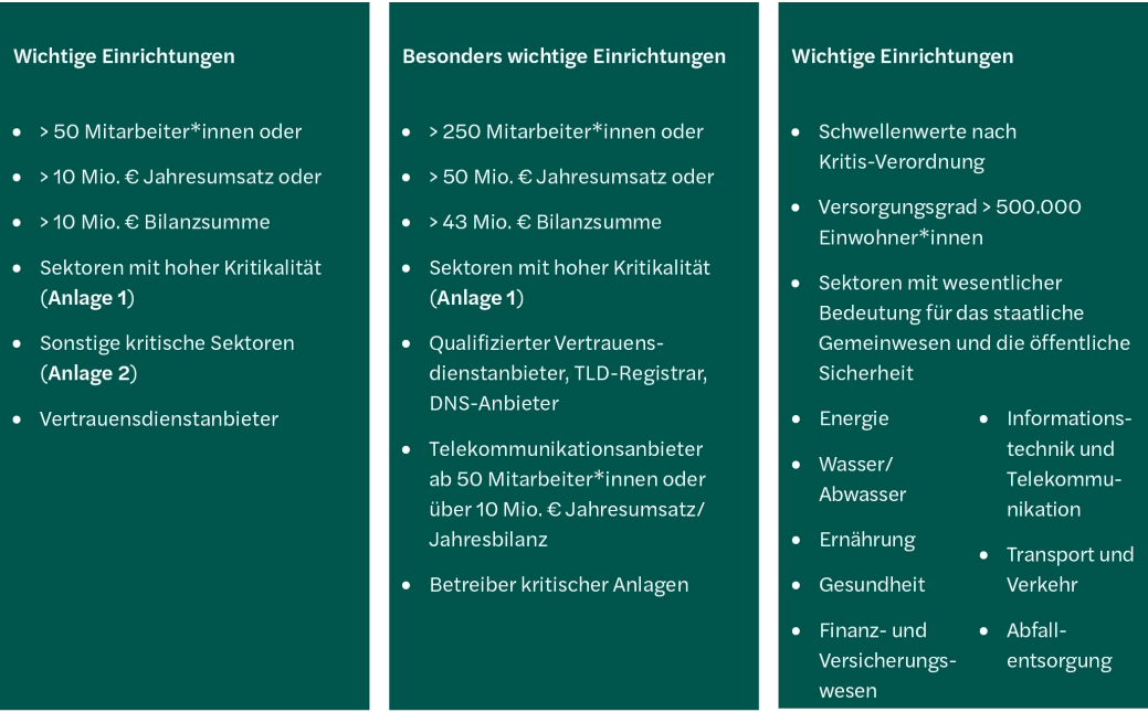 NIS2 definiert abhängig von Unternehmensgröße bzw. -umsatz und nach Kritikalität des Wirtschaftssektors wichtige und besonders wichtige Einrichtungen sowie wie bisher kritische Anlagen. Von dieser Einstufung hängen Geltung und Pflichten bzgl. Cybersicherheitsmaßnahmen ab.