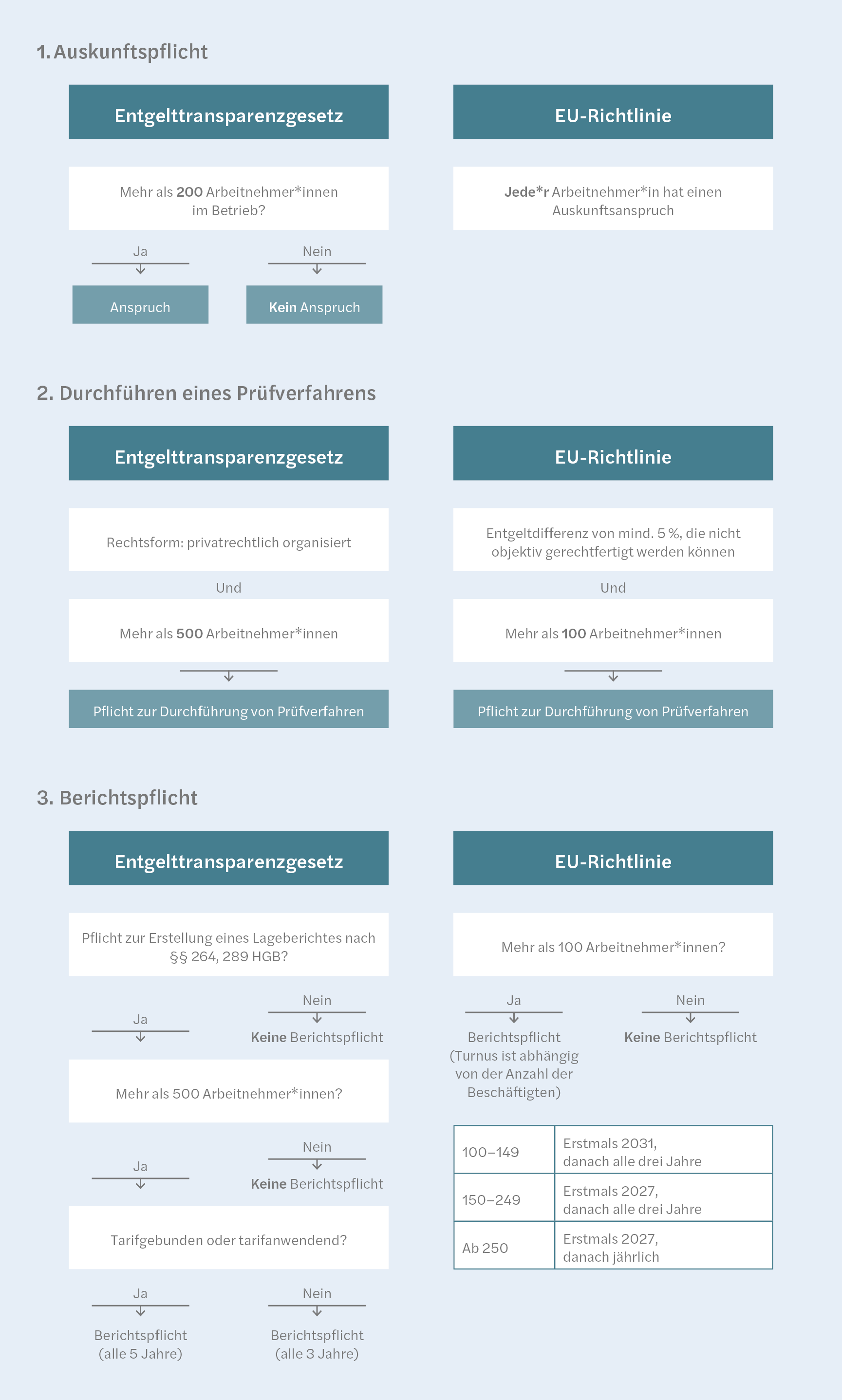 Das Entgeltgleichheitsgebot ist von allen privaten und öffentlichen Arbeitgebern zu beachten. Weitere Rechtsfolgen greifen erst ab bestimmten Betriebsgrößen. Bislang bestand in Bezug auf Auskunftsansprüche der Beschäftigten, die Durchführung von Prüfverfahren und die Einhaltung spezifischer Berichtspflichten eine Schonung der Kleinbetriebe mit bis zu 200 Beschäftigten. Mit der EU-Richtlinie hat dann jede*r Arbeitnehmer*in einen Auskunftsanspruch unabhängig von der Größe des Unternehmens. Zudem sind Privilegien für tarifgebundene und tarifanwendende Arbeitgeber geregelt.