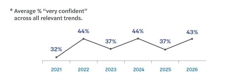 The picture is less positive on talent. Only 32% of leaders are “very confident” in tackling workforce scarcity, although overall confidence has improved from 68% to 75% year-on-year. Beyond technology, resilience is rising elsewhere. Confidence in managing supply chain challenges and regulatory compliance has jumped nine points, while ESG preparedness is up eight points.