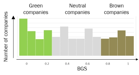 The classification of assets into "brown" and "green" is determined using the BGS (Brown-Green Score). This score is derived from Environmental, Social and Governance (ESG) reporting data for a large number of companies (over 40,000 in the CARIMA project). Companies are ranked by their BGS: those below the 30th percentile are classified as “green,” while those above the 70th percentile are considered “brown.” Companies in the middle range (between the 30th and 70th percentiles) are excluded from the construction of the BMG portfolio.