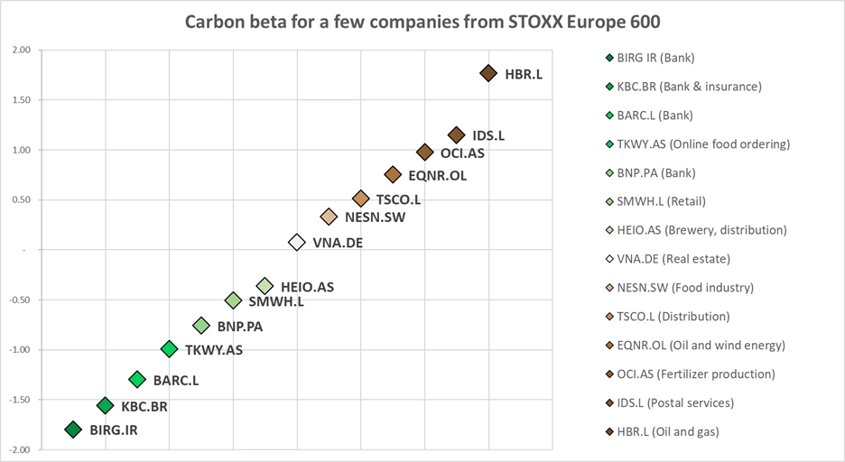 - If the carbon beta is positive and high, the asset's returns are highly positively correlated with those of the BMG. This suggests that the asset behaves more like “brown assets,” which are considered to be exposed to transition risk.