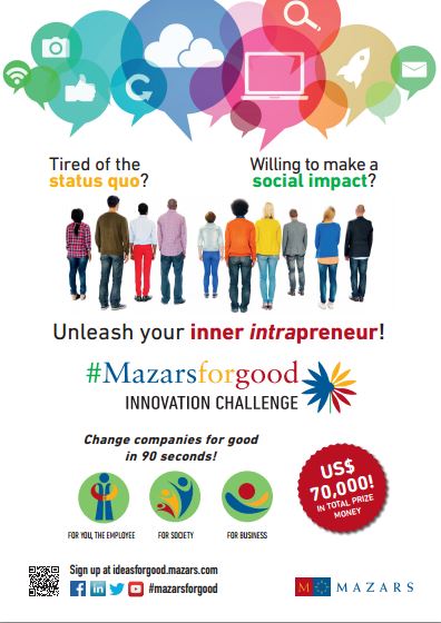 The 3 top winning teams will also have the opportunity to present their projects and receive their awards during Mazars’ Annual Conference in Belgium, Brussels. This annual event gathers Mazars' leaders worldwide in mid-December 2015 (date to be announced). Follow our Innovation Challenge on the #Mazarsforgood blog and on social networks (Facebook, Twitter, LinkedIn and YouTube) with the #Mazarsforgood hashtag