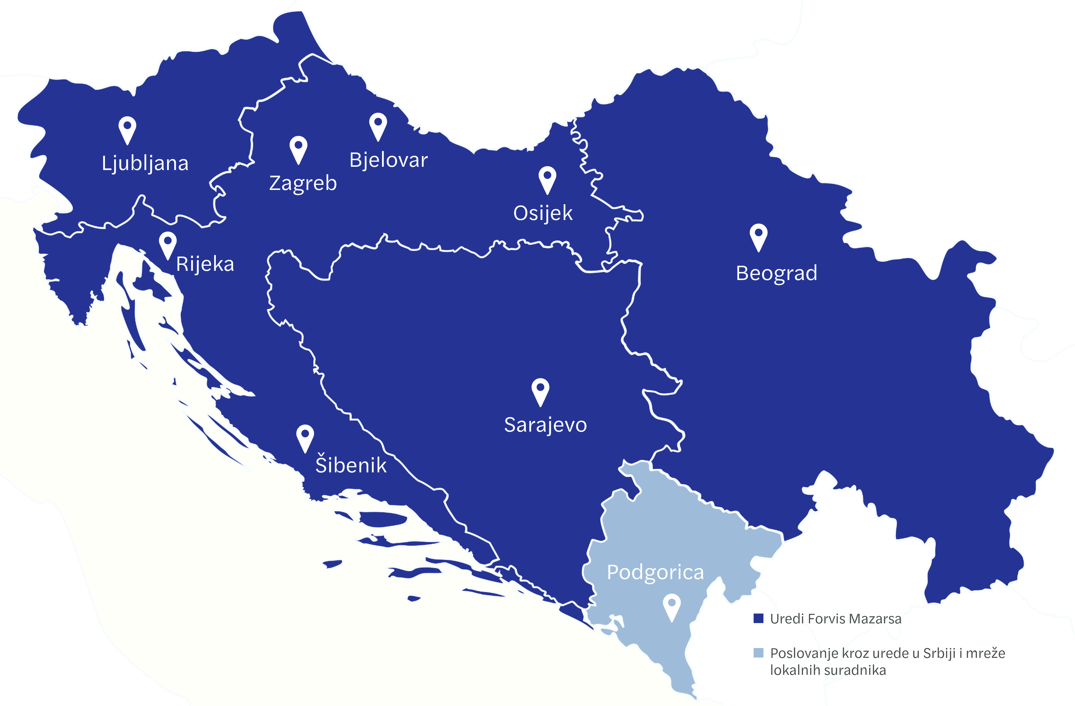Surađujemo s uredima u Forvis Mazarsu diljem svijeta, a posebno s uredima regije, tj. Srednje i Istočne Europe. Najbliže i svakodnevno surađujemo na razini Adria regije koju čine Bosna i Hercegovina, Hrvatska, Slovenija i Srbija, ali i Crna Gora (uz podršku lokalnih suradnika).
