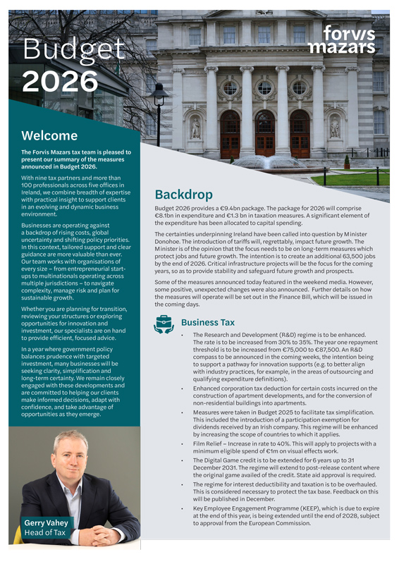 An enhanced corporation tax deduction is being introduced for qualifying apartment construction costs. The measure will allow an enhanced deduction of 125% of qualifying costs, up to a maximum additional deduction of €50,000 per apartment unit.