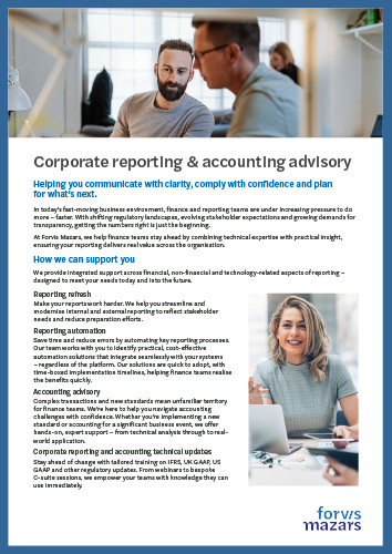 Whether you’re a fast-growing start-up or an established multinational, Forvis Mazars can help you communicate your story clearly and confidently. In today’s competitive landscape, access to capital and investor trust depend on how effectively you report – and how well you embrace innovation and technology to support that process.