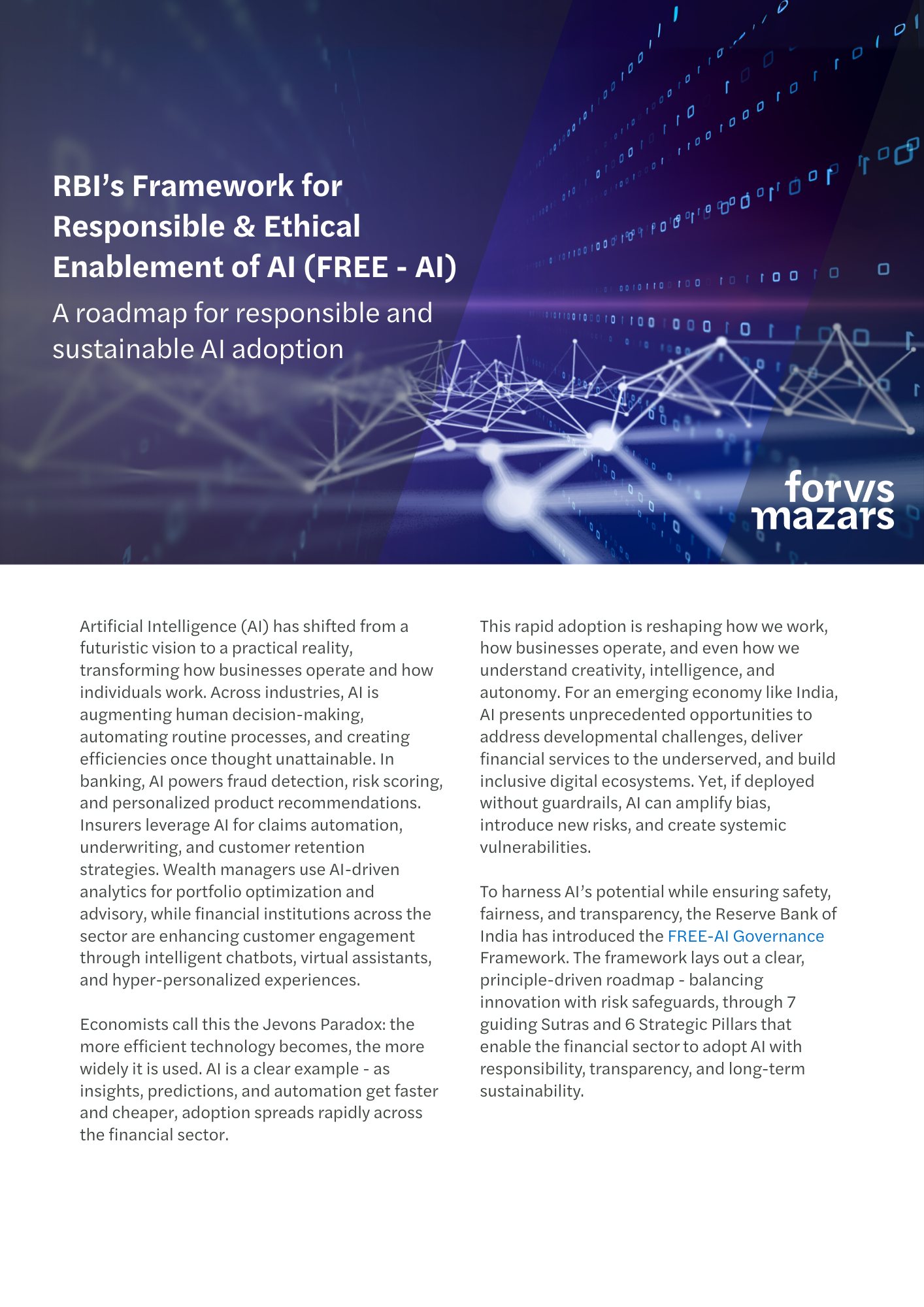 The Reserve Bank of India (RBI) has introduced the FREE AI Framework (Framework for Responsible and Ethical Enablement of Artificial Intelligence) —a guiding structure for adopting Artificial Intelligence responsibly in the financial sector. At Forvis Mazars in India, we see this as a pivotal step towards shaping a future where AI drives innovation while protecting trust, fairness and accountability.
