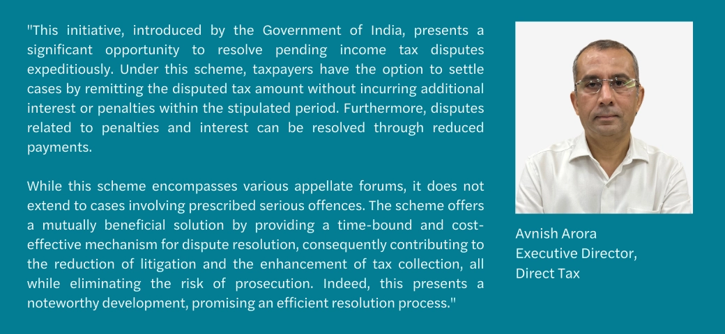 The Indian government introduced the Direct Tax Vivad Se Vishwas Scheme, 2024, under the Finance (No.2) Act, 2024. The scheme enables taxpayers with pending tax disputes to settle their cases, reducing litigation and freeing resources for both the government and taxpayers. It seeks to streamline the process of resolving tax arrears and ensures that cases do not linger in court for extended periods.