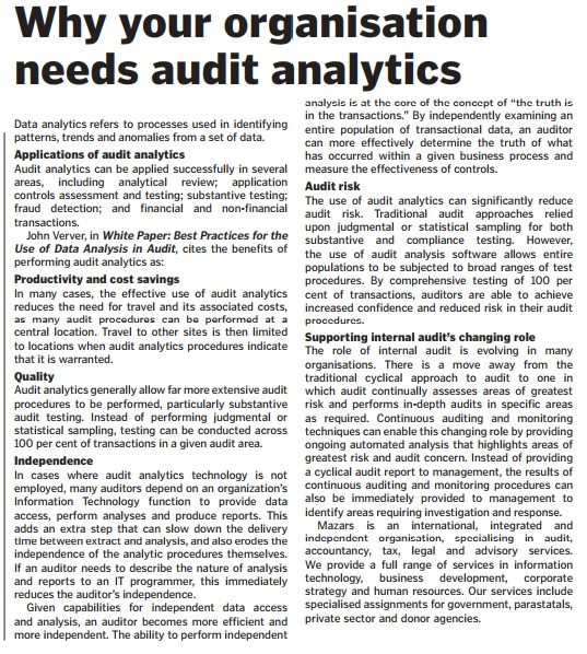 Data analytics is a process by which insights are extracted from operational, financial, and other forms of electronic data internal or external to the organization. These insights can be historical, real-time, or predictive and can also be risk-focused (e.g. controls effectiveness, fraud, waste, abuse, policy/regulatory noncompliance) or performance –focused (e.g. increased sales, decreased costs,improved profitability)