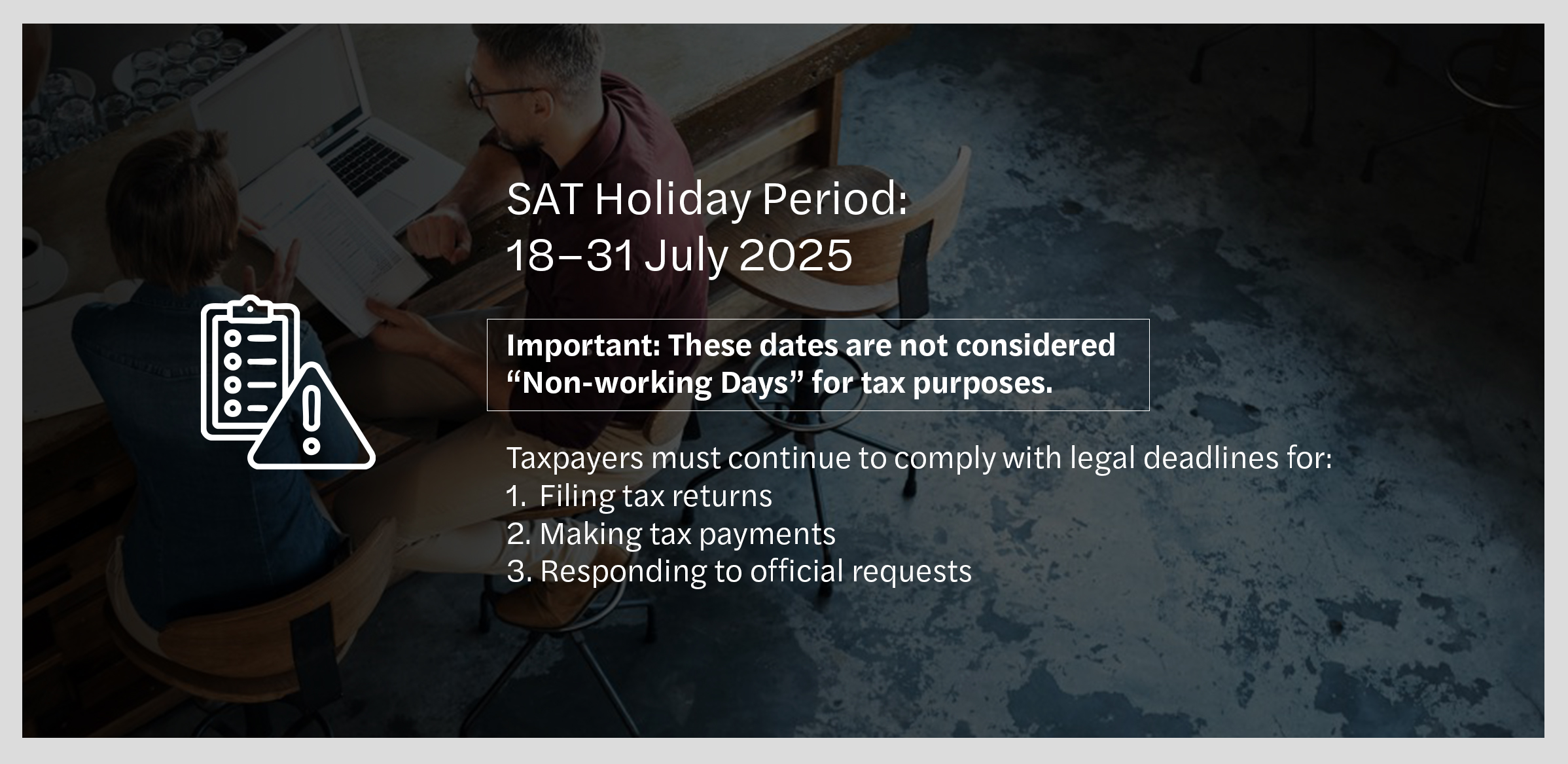 It is important to note that these dates will not be considered non-working days for the purpose of calculating deadlines related to the filing of tax returns and payment of contributions. On the other hand, taxpayers undergoing tax refund procedures or administrative processes before the SAT are advised to plan accordingly to ensure they meet deadlines, respond to information requests, or submit clarifications in a timely manner.