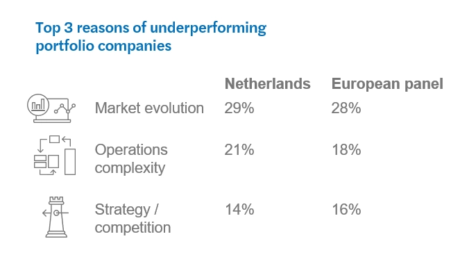 Recent heeft Mazars (Forvis Mazars per 1 juni jl.) onderzoek[1] verricht onder pan-Europese PE-fondsen. Uit het onderzoekt blijkt dat 70% van de investeringen volgens de verwachting bij aankoop presteert. Daarentegen presteert 30% niet volgens verwachting. In het onderzoek is aan PE-managers gevraagd naar de voornaamste oorzaken voor tegenvallende prestaties. Onder andere strategie, de kwaliteiten van het management en de complexiteit van de bedrijfsvoering werden genoemd. De kwantitatieve resultaten laten marktontwikkelingen, operationele complexiteit en strategie / competitie als oorzaken zien.
