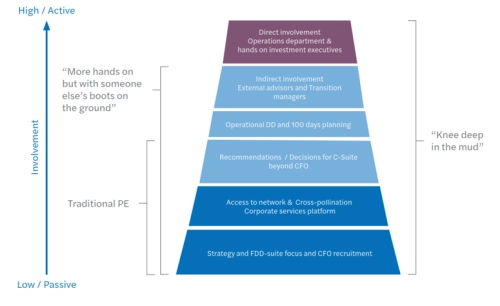 Dit type PE-fondsen voert op verschillende manieren meer operationele activiteiten uit. Er wordt een uitgebreid boekenonderzoek uitgevoerd door het PE-fonds. Daaruit komen operationele aanbevelingen en/of wordt er een 100-dagen plan opgesteld. Naast financieel en commercieel worden ook marges, operationele processen, HR, milieu en IT onderzocht. Investeringsteams en/of externe specialisten zijn nauw betrokken bij management van de portfolio onderneming.
