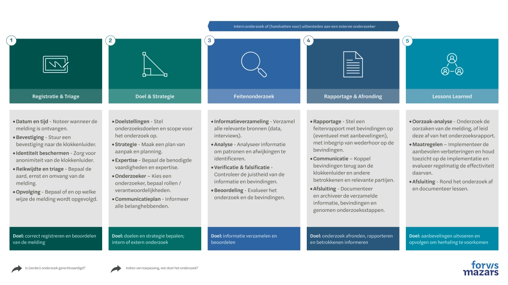 In de eerste twee artikelen van deze reeks hebben wij u meegenomen in (1) het belang van klokkenluiden en (2) mogelijkheden om de effectiviteit van uw programma te verbeteren. Met de ontvangst en registratie van een klokkenluidersmelding start het ‘opvolgingsproces’. Ter waarborging van de kwaliteit, vertrouwelijkheid en compliance met wet- en regelgeving is het aan te raden een vaste methodologie te volgen bij de opvolging van de melding. In dit artikel bespreken wij een methode bestaande uit vijf stappen (zie onderstaande afbeelding voor een overzicht). U kunt deze methodologie gebruiken als uitgangspunt en nader aanscherpen aan de hand van toepasselijke wet- en regelgeving en reeds bestaande interne procedures.