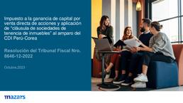 Mediante la Resolución Nro. 8646-12-2022 el Tribunal Fiscal ha emitido un precedente relevante para dar significado al término “bienes inmuebles” en la cláusula que regula la ganancia de capital generada por la venta de acciones efectuada por no domiciliado cuyo valor proceda en más del 50% de propiedad inmobiliaria en el marco del CDI Perú-Corea. Revise el alcance de esta jurisprudencia y nuestros comentarios sobre la misma en la alerta adjunta.