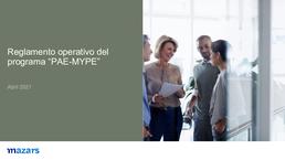 Con fecha 12 de marzo de 2021, se publicó́ la norma que aprueba el “Reglamento Operativo del Programa de Apoyo Empresarial a las Micro y Pequeñas Empresas (PAE-MYPE)”, el mismo que busca establecer los aspectos operativos y disposiciones complementarias necesarias para la implementación del Programa PAE-MYPE.