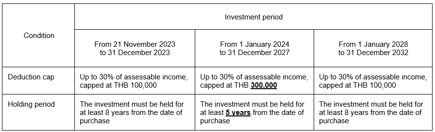 - Increased deduction amount: Investors can now deduct up to 30% of their annual taxable income, up to THB 300,000, which was increased from the previous limit of THB 100,000.