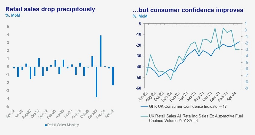 | July 2024 | UK retail sales fell by 1.2% month-over-month in June, after a strong 2.9% monthly rise in May. On a year-over-year basis, sales were down 0.5%. The cooler weather in the first half of the month was partly to blame: weather-sensitive sub-sectors such as clothing and footwear were particularly hard hit, falling by 1.6%. After a lacklustre first half of the year, with retail sales down 0.1% YoY, we expect retail sales growth to pick up in the second half of 2024. Our view is supported by improving consumer confidence, positive real wage growth (+2.3% YoY in May) and a tight labour market. |