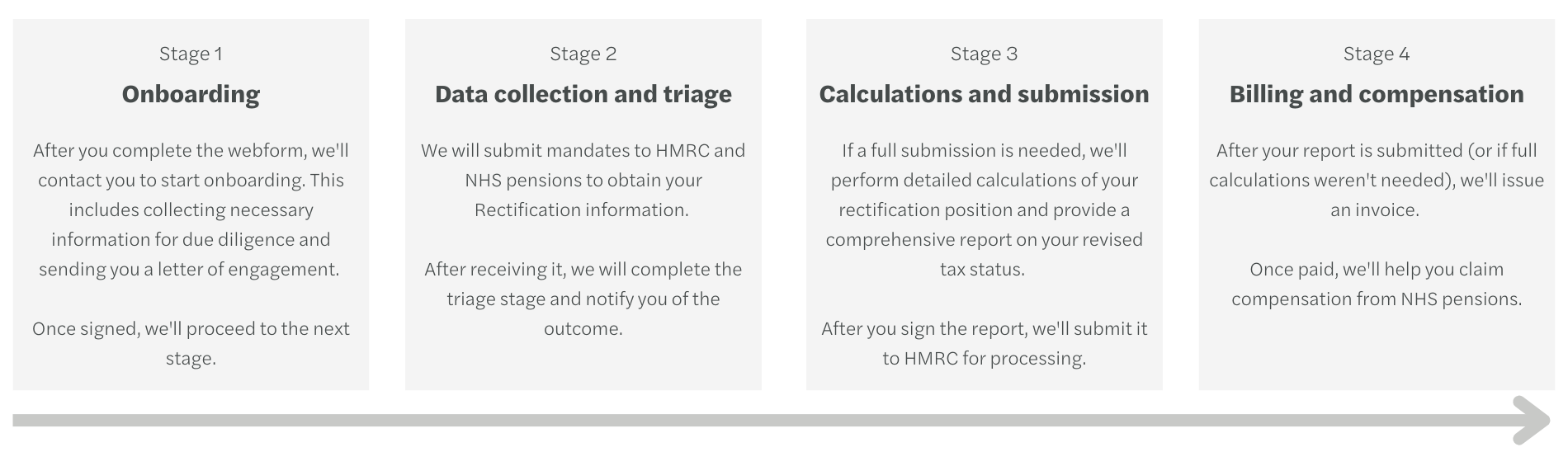 Once a client, we will ask you to sign mandates so we can request detailed data from HMRC and NHS pensions. Once the data is received, we will complete calculations to establish if you need to complete a full submission to HMRC – We’ll provide you with the outcome and move to the next stage.