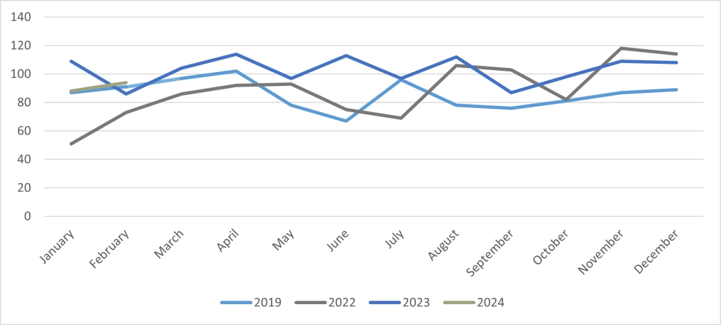In February 2024 there was a 100% increase in company insolvencies compared to the previous month with 26 registered in Northern Ireland which was 37% higher than February 2019. This is comprised of 9 CVLs, 14 compulsory liquidations and three administrations. There were no CVAs nor receivership appointments.