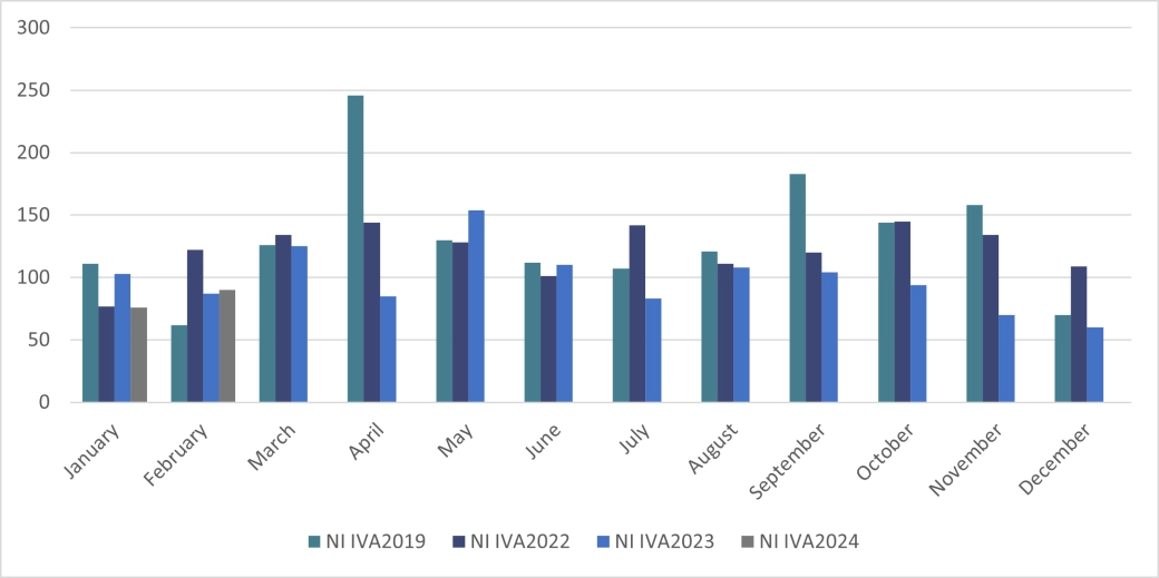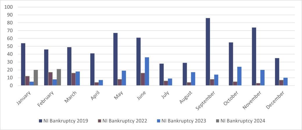 In February 2024 there were 122 individual insolvencies in Northern Ireland, 13% higher than in February 2023. This consisted of 90 IVAs, 21 bankruptcies and 11 DROs.