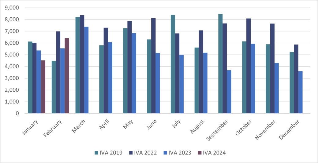 Individual Voluntary Arrangements (IVA) numbers appear to have increased significantly, with 6,420 recorded in February. However, those numbers include IVA’s that were approved more than two months earlier but were not registered until February 2024.
