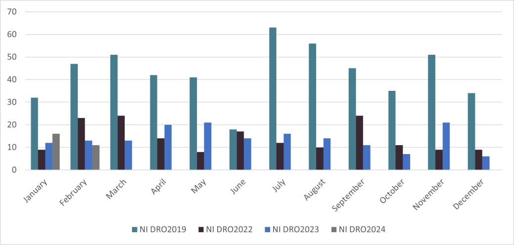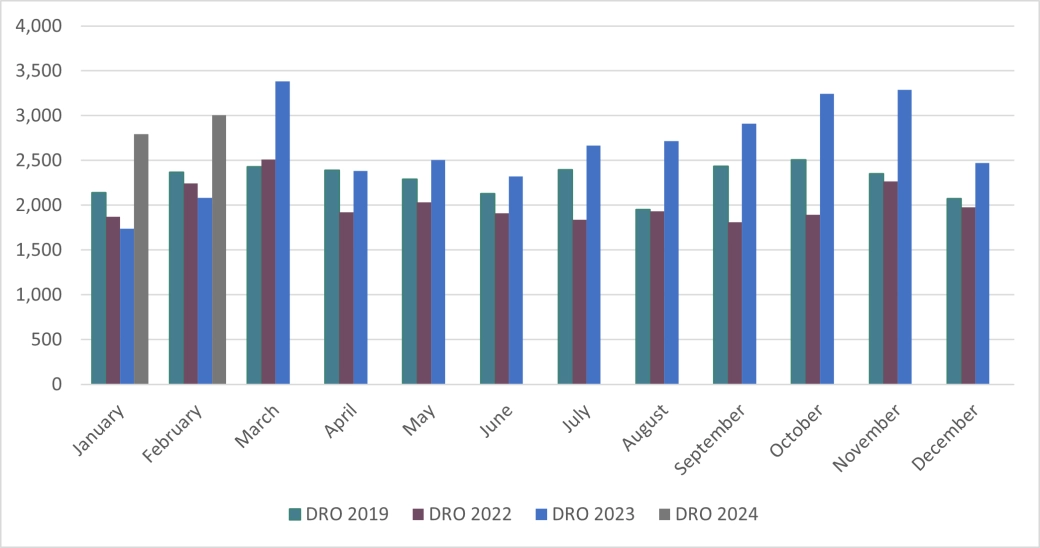 Debt Relief Orders (DRO) - 3,007 - increased significantly from February 2023 (2,083). Following the changes in criteria from May 2021, allowing easier entry into a DRO, take-up has increased, with 2023 averaging 2,643 DRO’s per month.