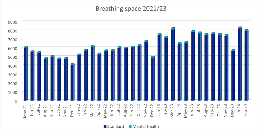 Breathing Space (BS) registrations in February reached 8,073 compared to 7,173 in February 2023. Registrations consisted of 109 Mental Health BS applications, and 7,964 Standard BS registrations, compared to the 2023 monthly average of 7,244.