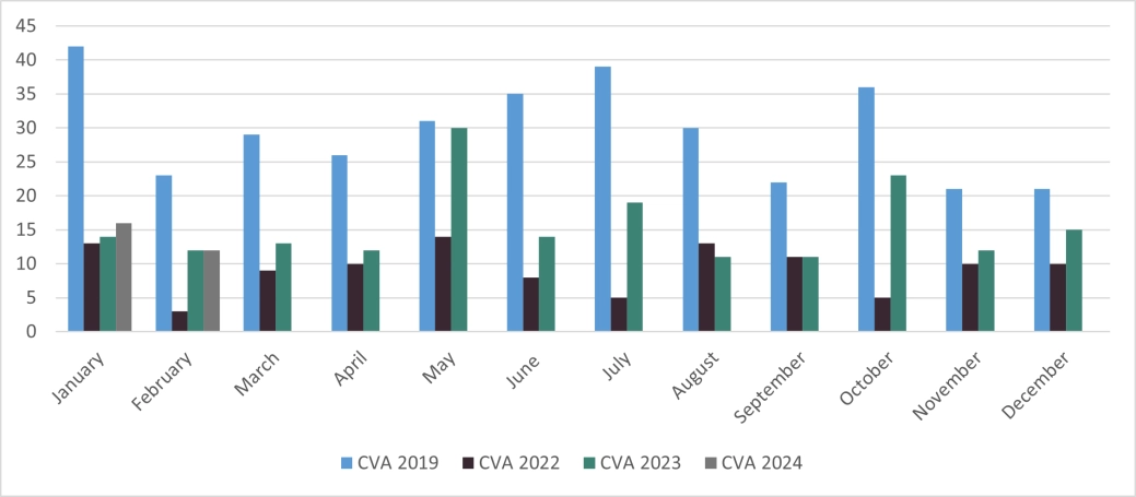 CVAs remain at low levels with only 12 approved in February 2024, down from 16 in January 2024 and at the same level as February 2023.