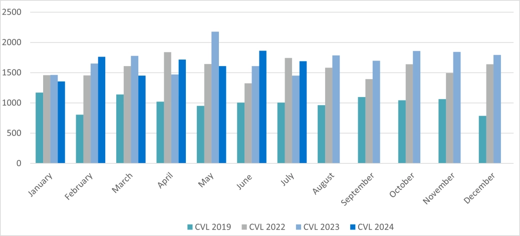 Creditors Voluntary Liquidations (“CVLs”) totalled 1,691, decreasing by 9% compared to June 2024 but were 15% higher than July 2023.