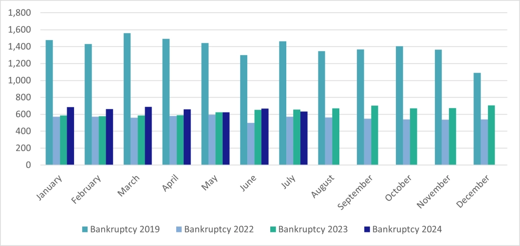Debtor’s bankruptcy applications reached 493 in July, compared to 509 in the same month last year. Debtor’s applications have remained steady in 2024, with the monthly average of 517 to date this year. However, many of those with liabilities between £30,000 and £50,000 will now turn increasingly to DRO’s and debtor’s applications will decrease over time as a result.