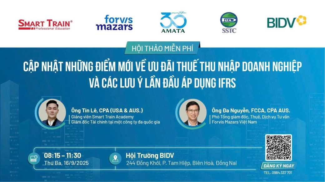 | 08:50 – 09:35 | IFRS 1: First-time Adoption of IFRS Mr. Tin Le, CPA (USA & AUS.) Smart Train Academy Lecture, CFO at a multinational corporation |
