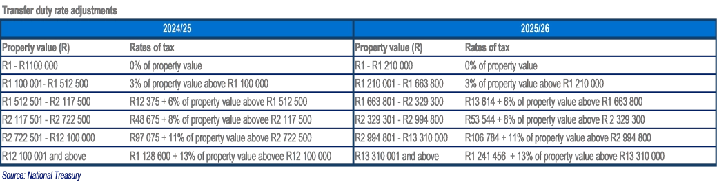 As part of the periodic reviews of monetary property values in the Transfer Duty tax tables, the monetary property thresholds for transfer duty determination will be adjusted upwards by 10 per cent to compensate for inflation. The transfer duty tax rates will remain unchanged.